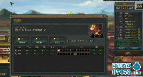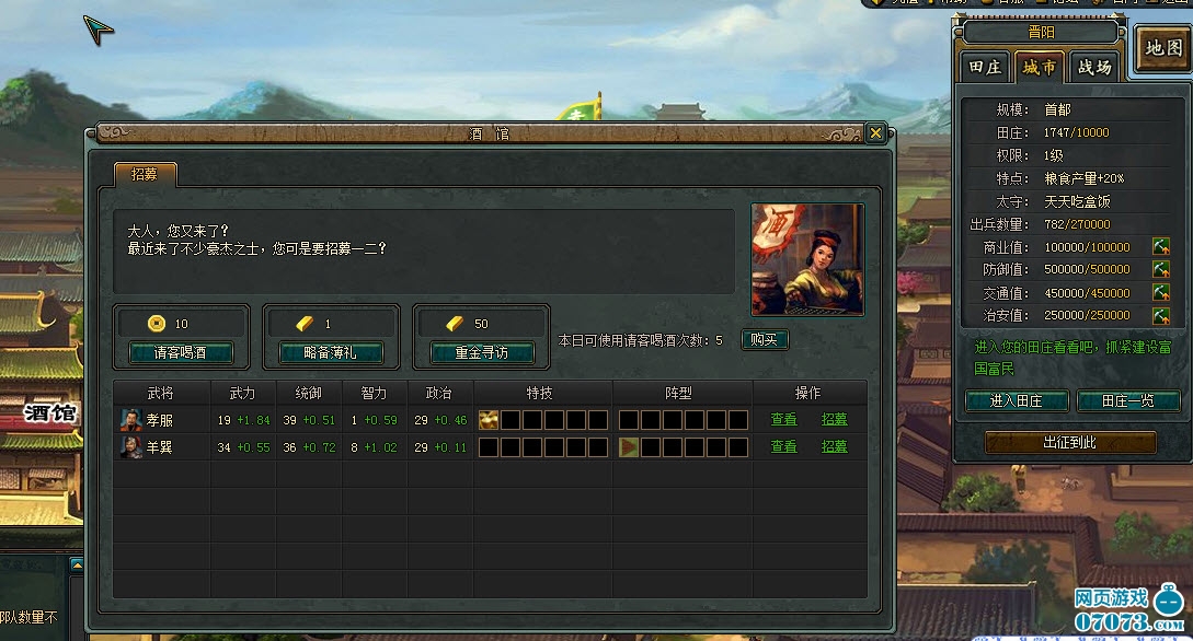 分城与兵种系统只是战争策略游戏最基础的东西,对于任何一款选择了三国背景的游戏来说,武将系统都是游戏的重中之重,玩家点击右上角的城市,进入城市界面,选择酒馆可以看到里面的武将,觉得不满意可以选择请客喝酒,略备薄礼和重金寻访三项,当然如果想要聘请到历史名将,当然要选择重金寻访了。