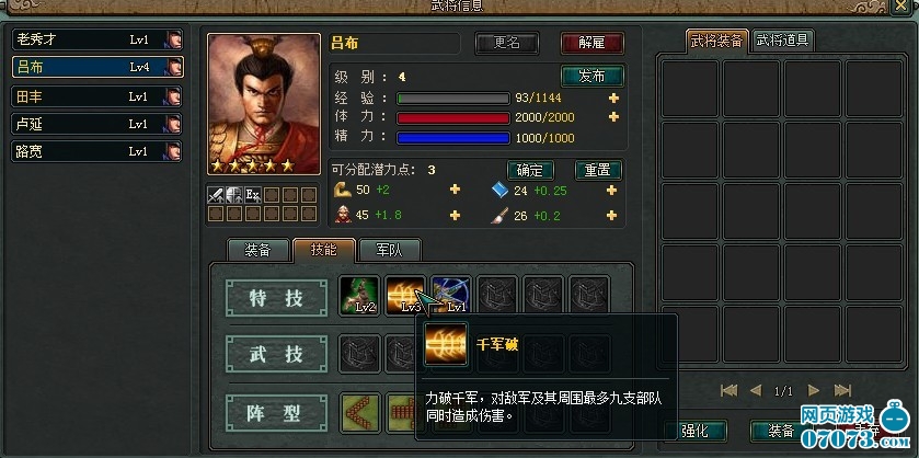 作为职业玩家的小编当然是毫不客气的将三国第一猛将——吕布收入囊中了,吕布的武力成长非常的高,当然最关键的一点是吕布拥有与本游戏同名的超强特技
