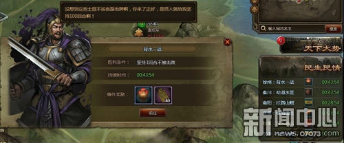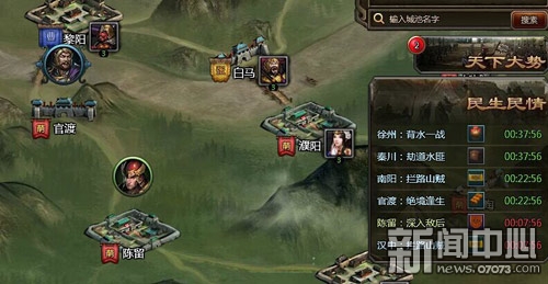 Mx175《大皇帝》在世界界面的侧面,有小地图,天下大势与民生民情。玩家点击民生民情就会出现一排需要玩家去帮助的任务。民生民情的任务是有时限的,时间过了之后任务自动消失,在世界大地图中可以看到有些城市上面冒出了个脑袋,这个就是需要玩家去平定的民生任务。