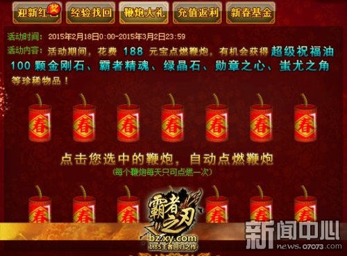 领红包,放鞭炮,见面说声新年好!在XY游戏《霸者之刃》2月18日至3月2日迎春活动期间,玩家每天都可花费少量元宝点燃迎春爆竹,赢取新春好礼。在XY游戏《霸者之刃》爆竹燃放活动面板,共有十四根红彤彤的的爆竹等待点燃,不过每根爆竹每天只可点燃一次哦。十四根爆竹十四份好礼,十四重惊喜甜如蜜!想要海量稀有道具,就来XY游戏《霸者之刃》爆好运!