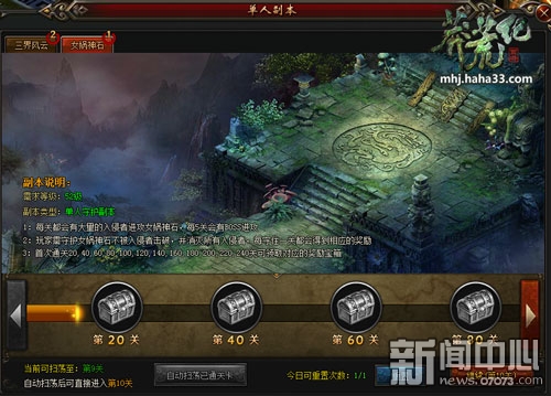 女娲神石是单人守护副本,52级开放,玩家在副本中通过抵抗一关又一关的敌人,来保护女娲神石免受破坏。除了保证自己不死外,还需要挑战极限输出,在限定时间内清扫关卡的敌人,这对装备和走味十分讲究,而玩家可以每天无限次地挑战副本,突破自己的极限。