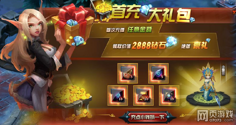 活动内容:在开服期间首次充值任意额度都将获赠价值2888钻石的"首充奖励"一份(详见下方奖励展示)。