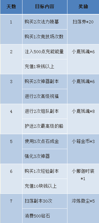 活动内容:开服7天内,我们专门为玩家朋友们定制了每日游戏玩法的计划目标,只要完成这类任务的指标,则可获得每日目标的丰厚奖励哦,你的游戏时间不再是枯燥无味的打怪练级,在这里你会享受到游戏带给我们的无穷乐趣,一起来嗨翻天吧!