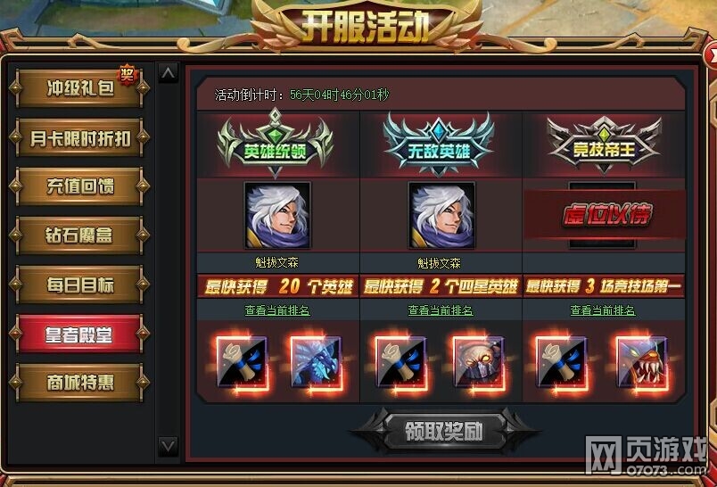 活动内容:开服7天内,只要能够以最快的速度完成,获得20个英雄,2个四星英雄、连续3天获得竞技场第一,即可获得服务器唯一限定独有的新英雄:冰龙、屠龙、剧毒术士和限量称号哦!就是和别的玩家不一样,赶快加入我们的新服队伍吧!