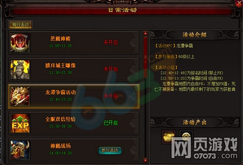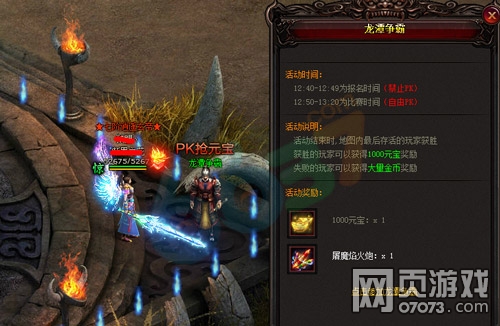 龙潭争霸比赛时间开始后,勇士之间就可以进行战斗PK,而且还是大乱斗。活动结束之后,只有龙潭争霸地图还站着(存活)人就是胜者,然而胜利的勇士就会得到1000元宝的奖励,看清楚了这是元宝而不是绑定元宝。失败的勇士也不要亏心,还有能够获得大量金币的招财进宝的安慰奖,希望你们下次再接再励,毕竟龙潭争霸活动每天都会进行。