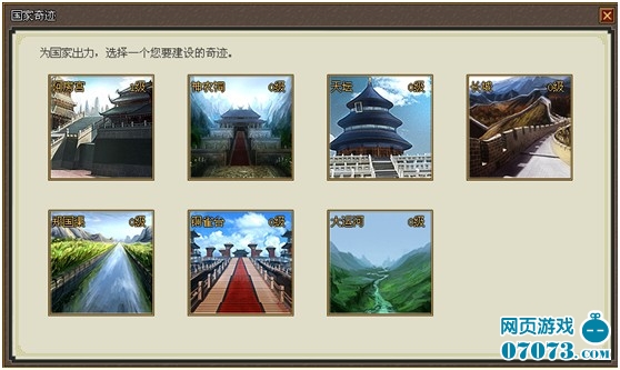 我们建议:请积极贡献国家奇迹!每个国家的国家奇迹是最重要的国有科技属性,因为它可以影响到本国的所有玩家,虽然它的投入是巨大的,但是一个国家每人每天捐献一小点,就很容易积少成多,聚沙成塔。而一旦完成了某项奇迹的建筑,那么获利可是巨大的,举个最简单的例子,国家奇迹阿房宫,每提升1级,国王就可以对国民封官加爵,而拥有官职的国民,每天可以领取数量丰厚的俸禄,以及珍贵的各类宝箱。宝箱可是获得英雄装备的唯一途径。