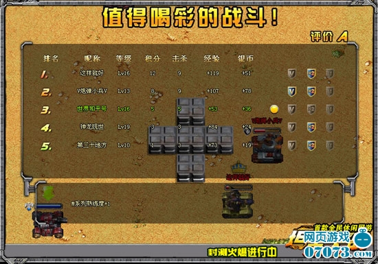 在对抗中,玩家一旦击破坦克数达到五次且积分最高,就会头戴皇冠出现,以展现其傲人的战绩。不过千万别得意,谁笑到最后谁才笑得最好,不到比赛的最后一秒,谁都有可能将你击破,抢走你大量的积分,让你一蹶不振,胜负往往就在一炮之间。