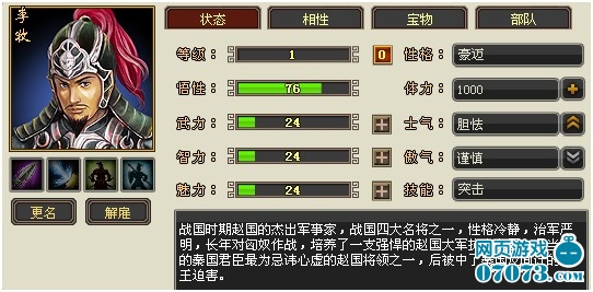 身为战国四大名将之一的李牧治军有方、爱兵如子,在为赵国抗击匈奴及抵御秦国的战斗中都发挥了重要的作用。李牧的技能是“突击”,技能发动的单位兵种必须是骑兵系,骑兵的高机动性使其在战场上的移动范围远高于步兵和弓兵,当李牧麾下所属战斗单位均为骑兵时,无疑将成为游走于战场的中坚力量和超级DPS队。