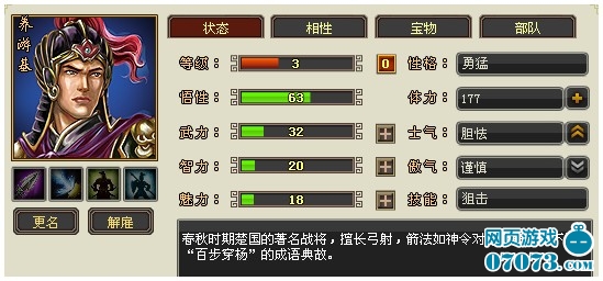 当一支携带弓兵的养由基出现在战场的那一刻,便是敌人骑兵部队噩梦的开始。伴随着“狙击”技能的发动,成片的骑兵倒在小养的周围,如果你是一位立志走弓兵系兵种的朋友,这位弓系男高音你是一定要招募麾下的,弓兵系兵种的本身的高攻击属性加上小养变态的伤害输出技能,一定会让你大呼快哉。