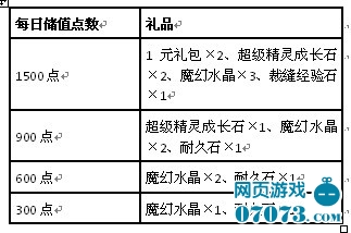 4,每日消费、每日消费、每日储值消费点数之和达到活动规则标准,皆可领取礼品;假设一个玩家某日内储值600点,并在当日内消费了900点,那么这个玩家将获得一份储值600点的礼品、一份消费900点的礼品、一份储值消费组合送礼1500点的礼品,共计三份礼
