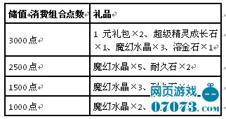 3,储值+消费组合送礼:活动时间内,每日储值和消费点数之和满1000、1500、2500、3000点的玩家将再获得一次不同档次礼品。