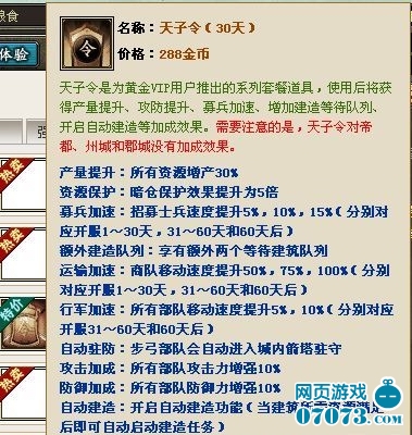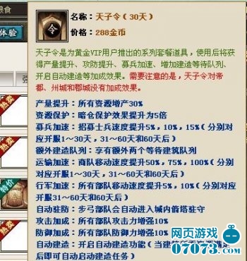 刚刚获得09年金翎奖最佳WebGame的《三国风云》可谓风头正盛,较长的运营时间为昆仑万维积累了庞大的玩家群体,同时也获得了极好的口 碑。正是因为他们一直遵循着重视玩家的硬道理,所以在评选期间突出重围一举获得年度最佳网页游戏。大家都很喜欢成为QQ会员,因为它不仅好看还很实用,游 戏内“天子令”正是游戏的VIP道具,这个VIP可是功能超强,比如产量提升、资源保护、募兵加速、运输加速、行军加速、自动驻守、攻击加成、防御加成、 自动假造、自动运输,几乎囊括了游戏内的所有特权功能。“天子令”价值288个金币,折合RMB57块钱,效果维持时间30天,算起来每天都要花费大概2 块钱,天呐,好东西确实贵呀。