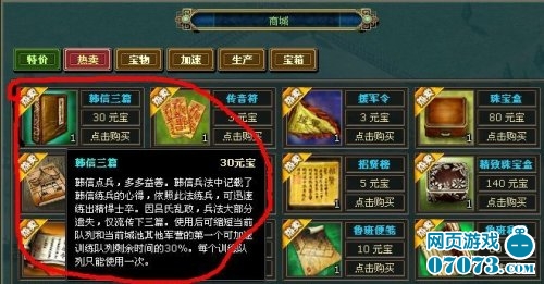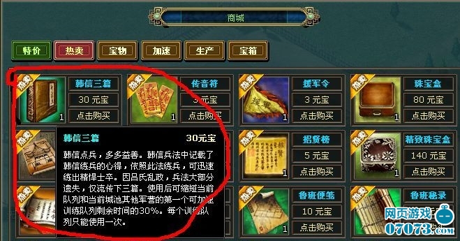 乐港公司开发的《热血三国》在网页游戏市场掀起了一场狂潮,可谓策略类网页游戏的领头羊。游戏拥有精美的画面,庞大复杂的战略系统三国战场和副 本,玩家扮演一个崛起于乱世的热血君主,金戈铁马平黄金杀吕布灭董卓统一天下。游戏中玩家最热衷的还是不断的扩张领土,需知扩张就需要战争,战争就需要士 兵,如果同时发现一块宝地,手头却没有兵将可用,那将是一件多么郁闷的事。每使用一次这个道具就要花费3块钱,看来想省点事就要破点财呀。幻想喜爱如果游 戏里随处都是可以缩短兵将生产时间的“韩信三篇”的话,那打起仗来该多过瘾呀。