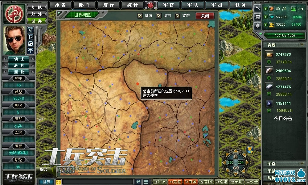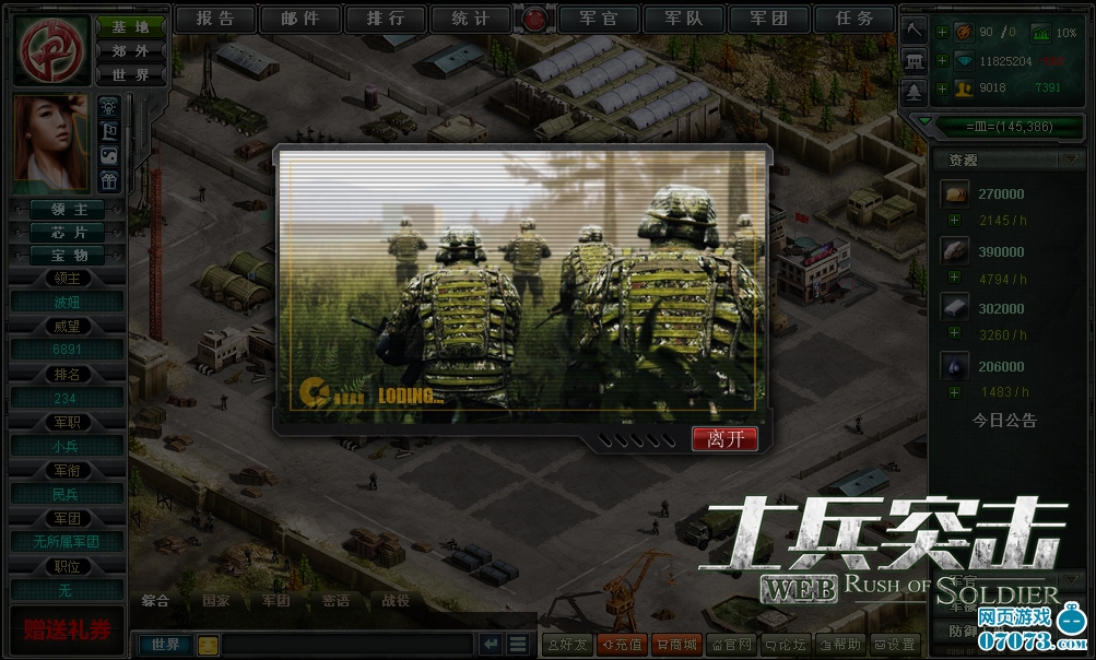 国战系统:《Web士兵突击》引入国家的概念,世界由三个国家和众多势力组成,军团如果占领了国家首府,就可以成为该国家的元首,能够决定与其他国家的关系。三个敌对国家之间的国战让策略游戏不再是玩家单个之间的碰撞,让百万雄师大会战成为真实的可能;而在中立地区雷火要塞却有着最为丰富的稀缺资源石油,世界大战就此发生!