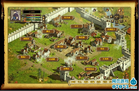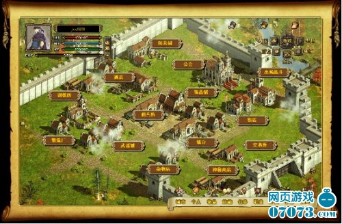 右下角菜单是主要功能菜单,右上角是辅助功能。中间是城市功能建筑。