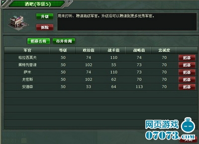 第二类就是属性非常好的野外名将,这些名将分布在野外的野地或者NPC占领的基地中,玩家可以先通过酒吧打听市井传闻中的这些名将的详细所在地点,只要玩家达到足够的军事实力,就可以通过占领名将所在的基地或者野地来俘虏这些名将。如果前期玩家兵力不足的情况下,建议俘虏野地的名将,这样会容易许多。
