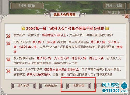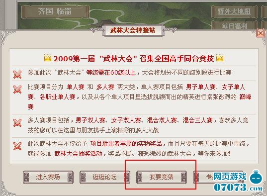 1、每天9:00--11:00我们将会提供部分比赛,给所有玩家竞猜,不管该玩家是否参加了武林大会都可以参加竞猜。