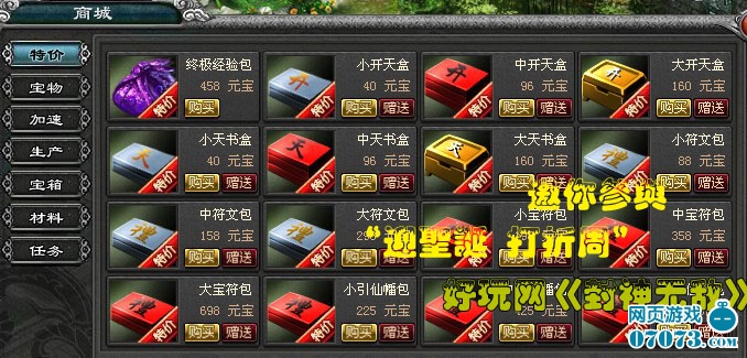 好玩网《封神无敌》新服【聚耀七星】震撼开服后,人气爆棚!为了感谢广大热情的玩家,即日商城打折大酬宾活动震撼开启,商品打折全线开放!全线商品惊爆价5折起,超低的价格,超值的物品,绝对抢人眼球!