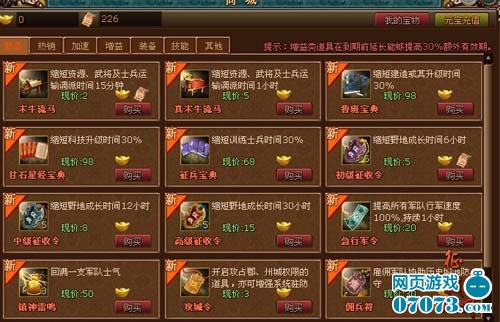 征兵宝典、征兵虎符、征兵檄文让你随时随地都能拥有无穷战力,超级活络散、镇神雷鸣让你武将征战沙场金枪不倒,而这些稀有道具如今却已七折价格出售,你难道不心动?
