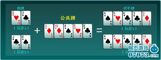 ¡¡¡¡´Óµ×ÅÆºÍ¹«¹²ÅÆÖÐÑ¡³ö×î´óµÄ5ÕÅÅÆ£¬×é³É“³ÉÊÖÅÆ”£¬ÓëÆäËûÍæ¼Ò±È½Ï£¬ÅÆÐÍ×î´óµÄÍæ¼Òʤ³ö¡£ ÔÚÉÏͼÖÐÎÒÃÇ¿ÉÒÔ¿´³ö£¬Íæ¼ÒAµÄ³ÉÊÖÅÆÓÐÁ½¶Ô£¬¶øÍæ¼ÒBÓÐÒ»¶Ô£¬¸ù¾Ý±ÈÅÆ¹æÔò“±ÈÅÆ²»·Ö»¨É«£¬´Ó´óµ½Ð¡±ÈÅÆ¡£ÈôÒÀ´Î±ÈÍê´óСÏàͬ£¬Ôò¾ù·Ö×¢Âë³ØÄÚµÄ×¢Âë¡£