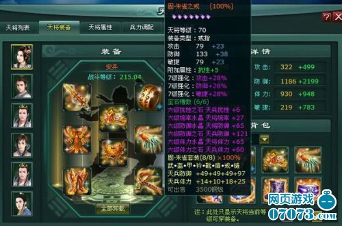 此外,兵阵的性质可以这样安排,全面提高两个步将的防御能力,将最高级的防御宝石和防御水晶镶嵌的两个步将的装备上;3号位飞将则全面提高它的敏捷属性,因为它是冒着枪林弹雨飞去厮杀的将领,提高它的敏捷值可以有效提高它的躲闪和机械能力,剩下的是三个法将,是站在原为进行远程攻击的将领,把它们的攻击能力提高上去就可以了。