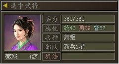 点评:许多玩家用蔡MM+张苞+董卓组合,高爆发力,RP在很多时候决定胜负;蔡MM攻击力弱,是完全辅助武将,无特技,真是弃之可惜!