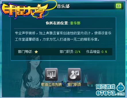在音乐部里,创作歌曲跟演唱歌曲合二为一,统一叫“歌曲工作列表”。打开列表后一目了然可以看到当然音乐部里创作的为灌制成专辑的单曲,点击“创作一首歌曲”,输入歌曲名称跟风格,选择作词跟作曲的员工。歌曲制作完成后还在同一个界面就可以选择演唱的歌手了。