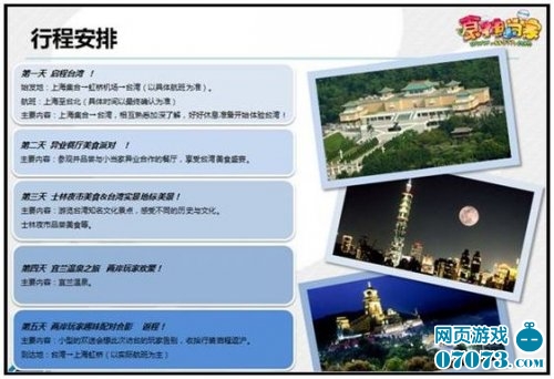 浪漫此行,节目缤纷。台湾美食5日游的整个活动期间,SITV人气主播及摄制组将全程陪同,实拍报道。其次,更有台湾当地形象气质绝佳的人气美女主持,领队同游。而更为赶巧的是,正逢台北国际电玩展的举办,本次活动因此临时再添焦点节目:参观火热电玩展,感受与众不同的游戏魅力。