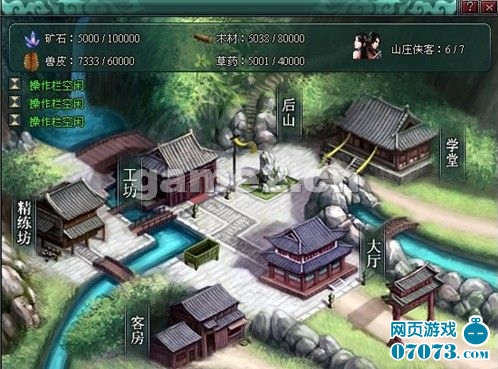 山庄拥有以下六个建筑:大厅、客房、学堂、工坊、精练坊、后山。每个建筑都拥有自己功能项目。