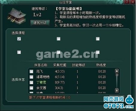 学堂是指使一个侠客学习并提高生活技能熟练度的地方。在此的所有课程每三十分钟刷新一次,建筑升级后可以增加课程所能提升的熟练度值。