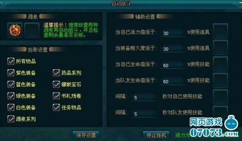 被老婆叫去做家务了,但正忙着打任务道具无法抽身,有挂机系统在,你还需要担心吗?根据你的需求调整好只捡极品装备、药品,当生命值低于多少自动吃药的设置,点击开始挂机,角色就会自动在地图里打怪了,而且稳定性极高,你甚至不用担心他打着打着跑出地图之外。