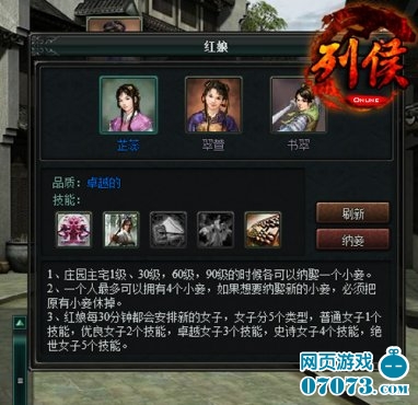 俗话说,糟糠之妻不可弃,但是……小妾应该不算糟糠妻吧。在新版中,要玩《列侯》玩家会发现,在民居瞎逛的时候会出现NPC,提醒你有红娘出现,这就是用来刷小妾的红娘系统。但是有一点要提醒玩家,如果你要换小妾,就要先把家里那位给休掉,左拥右抱这种好事想想就好。小妾有普通、优良、卓越、史诗和绝世之分,等级越高随机技能就越多,这五个小妾的随机技能从1到5逐级增长。