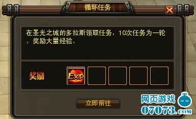 4311《惊天战神》循环任务,我们达到15级之后,可以去圣光之城的NPC多拉斯领取任务。循环任务每天只可以做一轮,一轮为十次,完成任务之后,可以获取大量的经验,这绝对是我们欲强大最有力的途径之一。循环任务的内容主要为三类,分别是拜访指定的NPC、消灭指定的怪物、去NPC处购买指定的药水道具,领取时随机产生,并且经验随着次数的增加会进行递增。