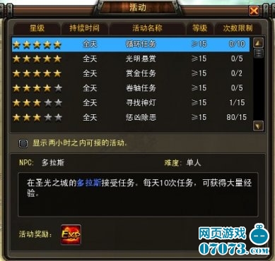 我们不再是少年,应该知道,做任务是需要一定的实力的;在4311《惊天战神》之中,我们在等级达到15级之后,系统才会向大家开放许多任务,循环任务便是其一,除此之外,还有卷轴任务、悬赏任务、黑暗侵袭等,我们可以通过E键打开游戏活动面板查看详细信息介绍。