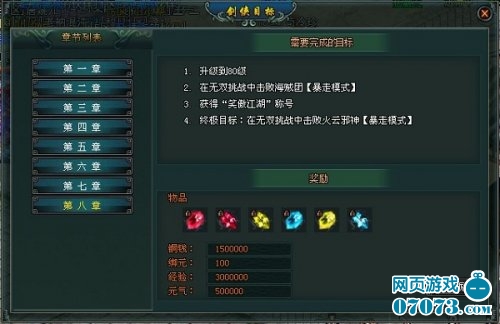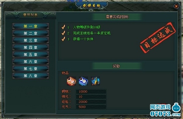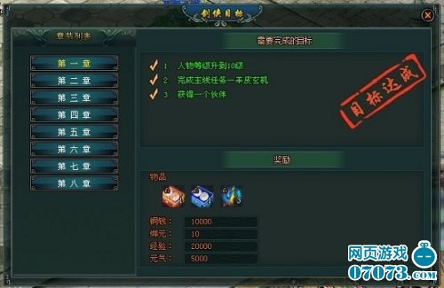 目前37wan《剑侠奇缘之侍魂》中的剑侠目标一共分为八个章节,从玩家达到10之后依次开启,每个章节的具体任务如下: