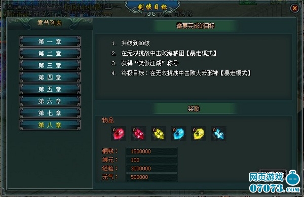 第八章:人物等级达到80级;在无双挑战中击败暴走模式海贼团;获得“笑傲江湖”称号;在无双挑战中击败暴走模式火云邪神。