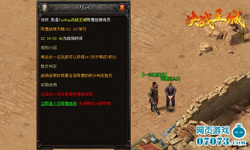 饥饿游戏每年举办一次,但阵营大战会在每天准时开启,自22:10开始,至22:40结束,合共30分钟的时间。参加的方式也很简单,玩家只要到达30级以上,便可以前往沙漠之城,寻找阵营战的接引NPC。