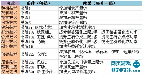 内政科技可以为资源生产和建筑建造提供一定的加成,想要在游戏中富国,这些技能的研究都是必不可少的。那么这些科技的效果都是什么呢?建造有什么条件需要呢?请看下图。