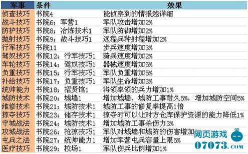 军事科技可以通过升级科技提升军队战斗、防御等加成,而且有些兵种只有科技研究完成,才能进行招募。比如大家都很喜欢的床弩就受到抛射科技的影响,当抛射科技到达10级,才能招募床弩,而更高级的投石车需要玩家的抛射科技达到15级。想要强兵的玩家一定要注意这些科技。