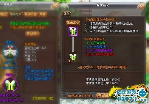 昆虫的品种良莠不齐,那么如何让昆虫成为你的强力助手呢?总的来说,昆虫分为白绿蓝紫四个品级,紫色为最极品!而不管是哪种品级,如果不经过强化,昆虫发挥的作用并不会很大!昆虫目前最高的强化等级为17级,成功与风险总是一对孪生兄弟,一旦强化成功,超强的属性加成将会让你大吃一惊哦!还在犹豫什么呢,赶快来培育属于你的昆虫吧!