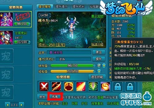 在Game2《梦幻飞仙》的升级版仙宠系统中,玩家在宠物学会技能之后,可以通过仙宠炼魂来提升技能等阶。旧版的仙宠系统中,宠物的技能经验都是通过仙宠融合来快速提高的。仙宠融合虽然可以方便地将一只仙宠的技能经验加在另一只宠物身上,但是用于融合的仙宠必须是玩家经常带,级别比较高的。仙宠炼魂则比融合要方便很多,效果成倍增长喔!