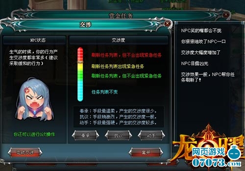 相比之下,接取赏金任务得到信仰力大概是最快速的方法了。接取赏金任务,玩家可以先运用放大镜了解下任务,若是有5+神力石头以上的奖励,就直接接取。若是奖励太低,可以与NPC进行交涉,根据左边的提示点击相应的交涉按钮。此外,就是直接运用赏金优待券进行刷新。优待券可以直接用活动徽章兑换,或者使用金币购买,可以无限刷新任务。