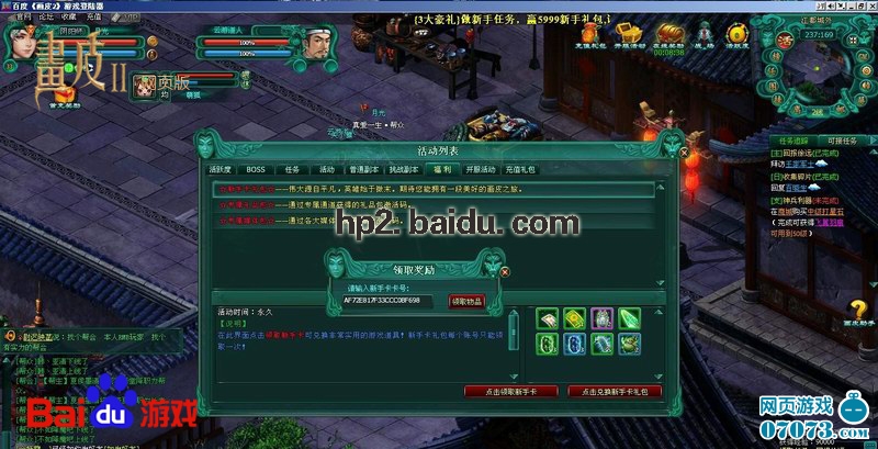 豪礼二:“新手卡”,内含绑定钱币10000、精神药水2、初级打星石3等