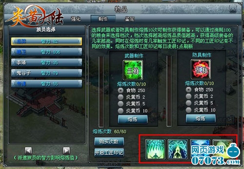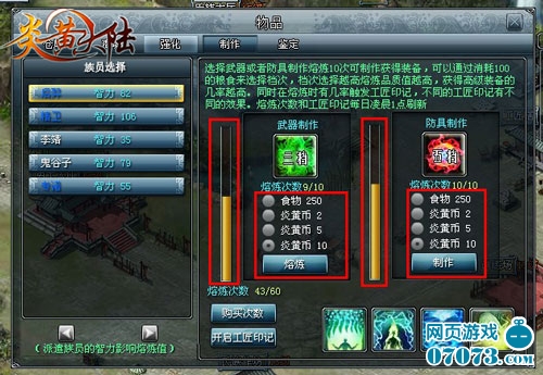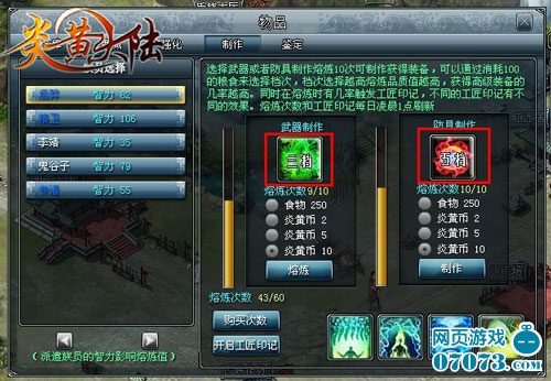 首先玩家在家园界面的正下方找到自己的“氏族作坊”点击后,选择“制作”,将进入装备的制作界面,界面左边显示的是你所拥有的武将以及他们的智力,从这点就能看出武将智力的高低对制作有影响,当然肯定是智力越高越好!右边分为“武器制作”和“防具制作”的选项,每种制作下面都会有个档位的选择图标,点击图标档位将会随机更换,档位的高低将会对制造出的装备品质高低有所影响哦!