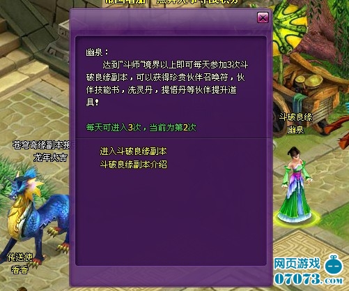 达到“斗师”境界就可找到副本使者“幽泉”进行斗破良缘挑战,每天可参加3次。这里会掉落洗灵丹、提悟符、伙伴技能书、伙伴召唤符、提悟保护符等等,每一样都对伙伴提升实力十分有用。组队或单独都可进入,但副本内敌人众多,推荐组队进入。