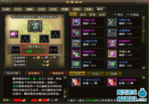 打磨:打磨时为宝石随机附加一条属性,攻击类宝石只能附加攻击类属性,防御类宝石只能附加防御类属性。不会附加与宝石属性相同的属性。雕琢属性有绿,蓝,紫三个品质,同品质同属性的宝石等级越高,其价值越大。