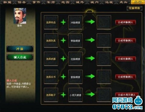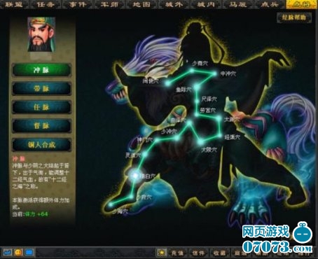 在《梦想三国》的点将台上,玩家可选择任意武将点击“经脉”按钮进入经脉界面,开始打通经脉。经脉界面包括冲脉、带脉、任脉、督脉、小周天五大脉络,打通5大经脉后分别增加武将的体力、统御、武力、智力、敏捷5大属性。每个穴位上都有心魔驻守,战胜心魔才可打通穴位。脉络打通后,点击“铜人合成”按钮可以将多余的装备与铜像合成铜人,再将铜人注入打通后的穴位激活穴位,就会获得相应的属性加成。经脉打通且激活后,武将脱胎换骨,内力大增。