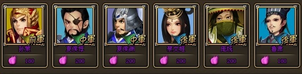 到了50级之后,玩家的蓝色武将是一定要换的。先说中军,夏侯惇、夏侯渊、一个强力攻击前军、一个攻击中军;再说后军,庞统、蔡文姬、一个控制中军、一个提升士气,都是不同的类型。这一时期有两种将领搭配方法: