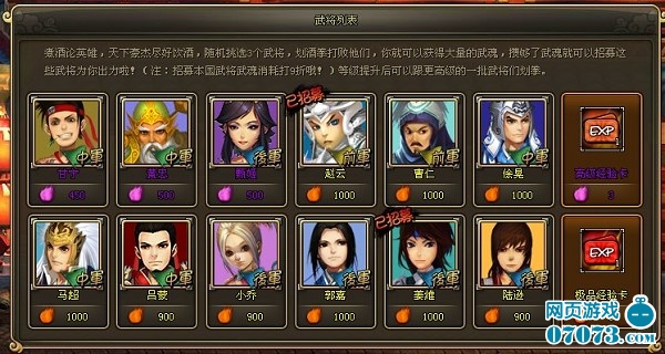 游戏初期面临选择招募的武将分蓝将和紫将。蓝将在初期是必须招募的。初期蓝将推荐徐庶,加血很给力,配合系统赠送的绿色武将凌操使用。凌操的格挡反击很实用,成长低点不是问题,强化跟上一样好用。这时大家可以攒钱主要对酒拿紫魂,等到可以出战人数五个的时候大家就可以出紫将了。