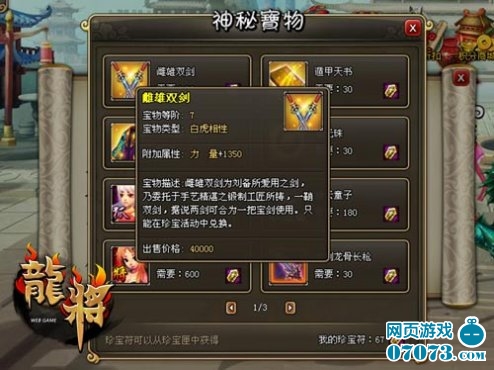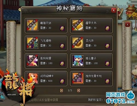 传说,在要玩《龙将》里,谁能得到天降的神级宝物,便能成为这大地上的新一代主宰!要玩《龙将》珍宝活动推出最新宝物-7阶宝物,谁要想得到最强大的属性加成,得到最厉害的4围属性,那就赶快参与珍宝活动,换取神一般的7阶宝物吧!